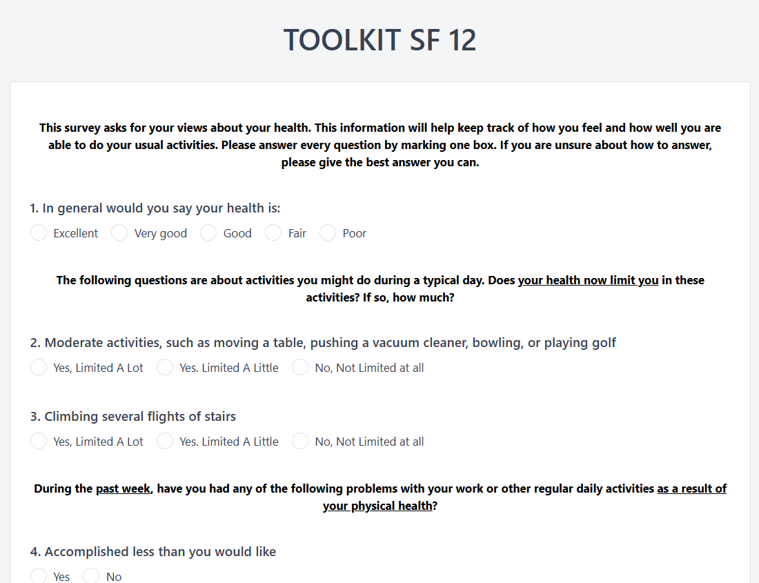 The SF-12 is designed for self-administration — patients complete it independently without clinician assistance. It can be delivered by any healthcare provider or researcher who needs a brief, validated measure of overall health status. Zentake enables any practice to include it seamlessly in their intake workflow.