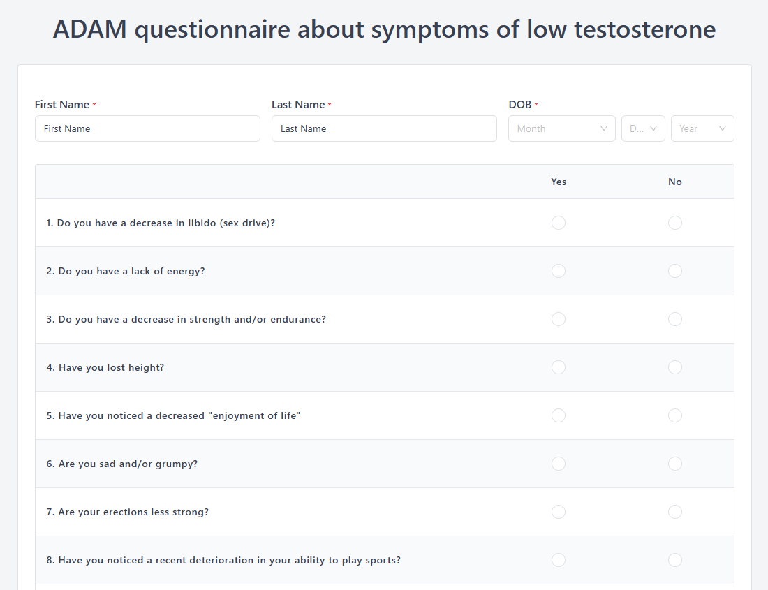 The Androgen Deficiency in Aging Males (ADAM) Questionnaire is a simple 10-item self-assessment that evaluates symptoms associated with low testosterone levels. Each question is answered with a straightforward “yes” or “no,” focusing on areas such as reduced sexual desire, fatigue, mood changes, and decreased muscle strength.