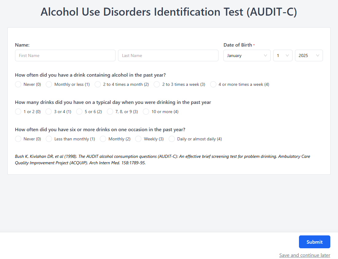 After Zentake: Patients complete the form digitally—on a tablet or phone—while Zentake instantly calculates scores and stores results securely. Providers access data in real time, improving both efficiency and patient satisfaction.