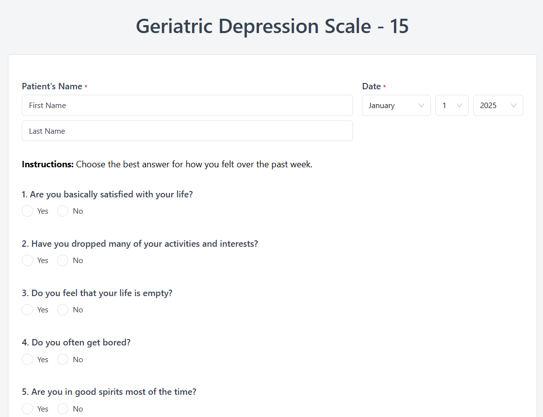 Simplify and secure your geriatric depression screeningswith Zentake’s digital GDS-15 platform. Start your free trial today to providetimely, HIPAA-compliant mental health assessments for older adults whileimproving efficiency, accuracy, and patient engagement.