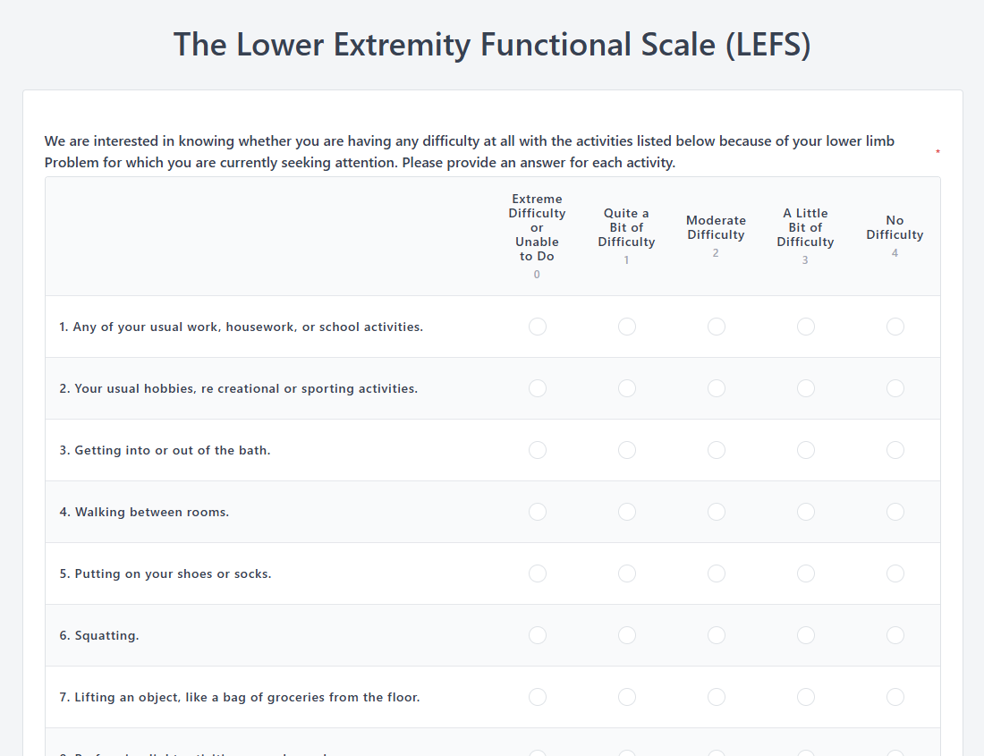 The LEFS plays an essential role in evaluating a patient’s physical function and mobility following lower extremity injury or surgery. It helps providers quantify changes in rehabilitation outcomes, ensuring that treatment decisions are data-driven and patient-centered.