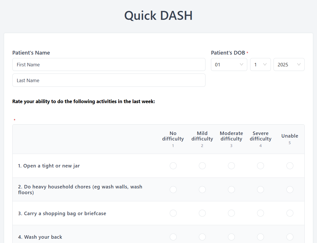 The QuickDASH typically takes only a few minutes to complete. Its shortened format reduces patient burden. Digital completion further improves efficiency. Patients can complete the form in-clinic or remotely. Automated scoring provides immediate results.