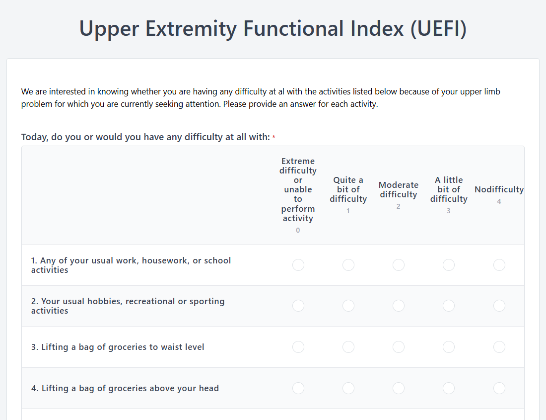 The Upper Extremity Functional Index is commonly used by physical therapists, rehabilitation specialists, and orthopedic clinicians. It is appropriate for adult patients with upper extremity conditions or injuries. The UEFI patient questionnaire relies on patient self-reporting. This makes it easy to administer across clinical settings. It is suitable for both clinical practice and research.
